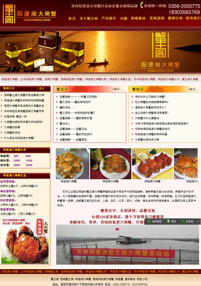 晉城陽澄湖大閘蟹-蟹王閣專賣店,提供正宗陽澄湖大閘蟹和大閘蟹禮券,我們應(yīng)對(duì)您不同的需求為您訂制了各種價(jià)位的大閘蟹券和包裝精美的大閘蟹禮盒。咨詢熱線:18303565769 網(wǎng)址http://www.jcsdzx.com |